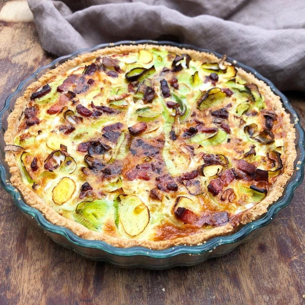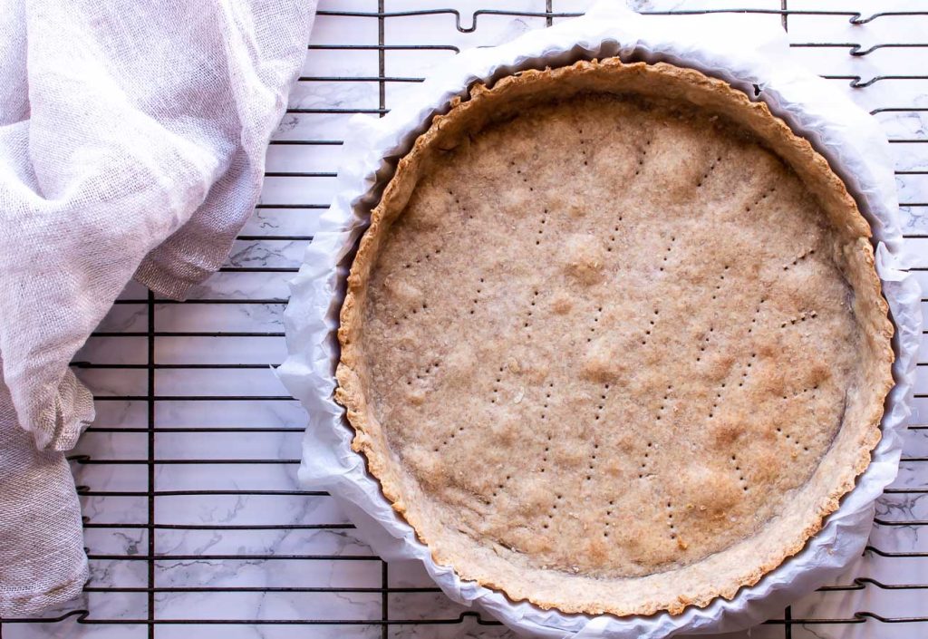 Olien gnides ind i melet med fingrene eller en håndmikser, vandet tilsættes, og dejen æltes let sammen til en lind dej. Vandmængden kan svinge lidt, alt efter temperatur og meltype. En tærteform smøres, og dejen trykkes ud i formen og op langs kanterne med fingerspidserne. Der prikkes i dejen med en gaffel og den forbages […]